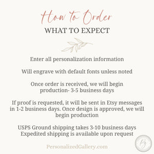 We will send a proof via email in one to two business days to customers with a custom design or to clarify order request. Standard design orders that only have name and date changes will not automatically receive proofs. Proofs are available upon request.